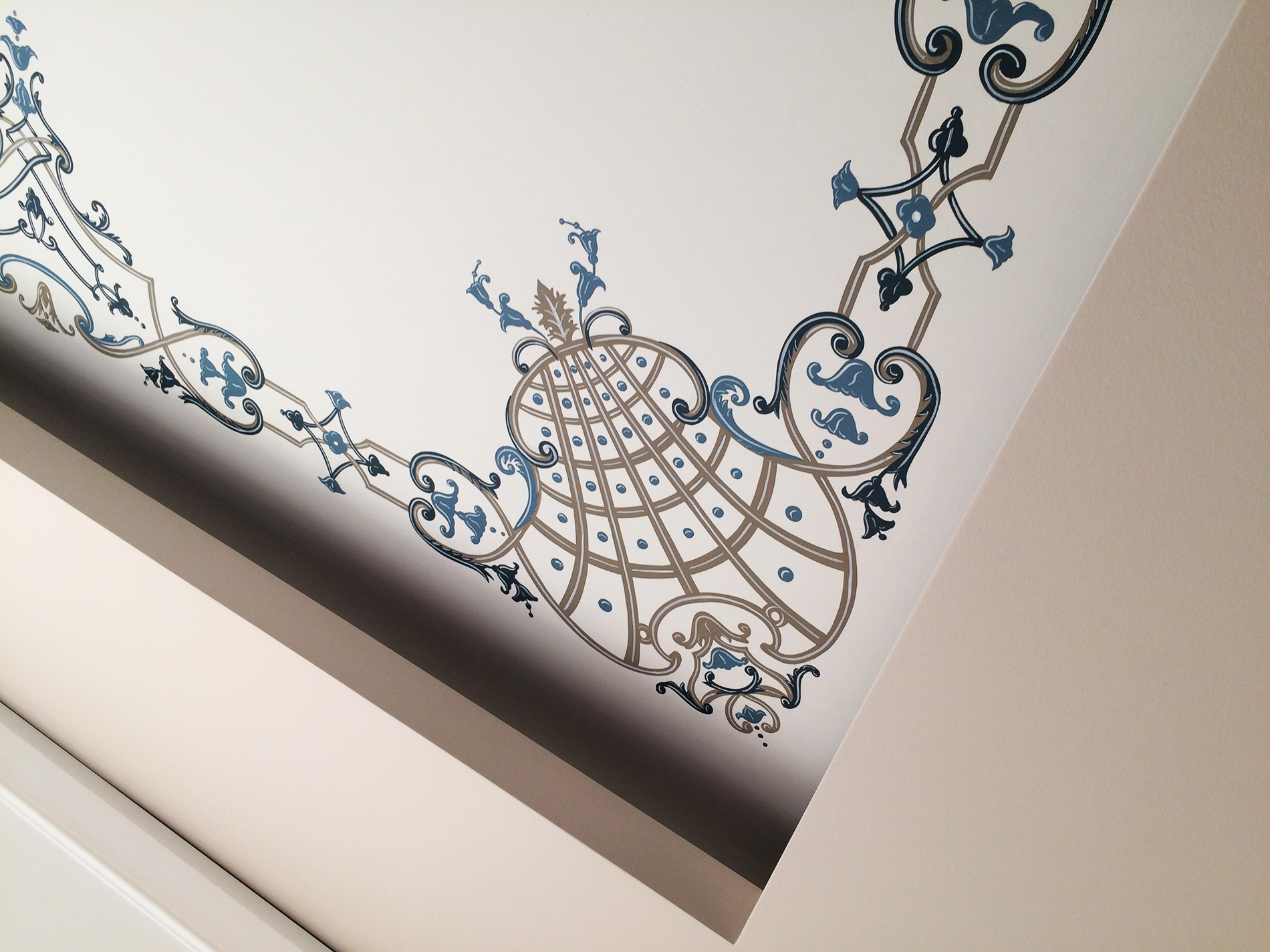 На потолке обращает на себя внимание роспись. Все работы выполнены вручную!