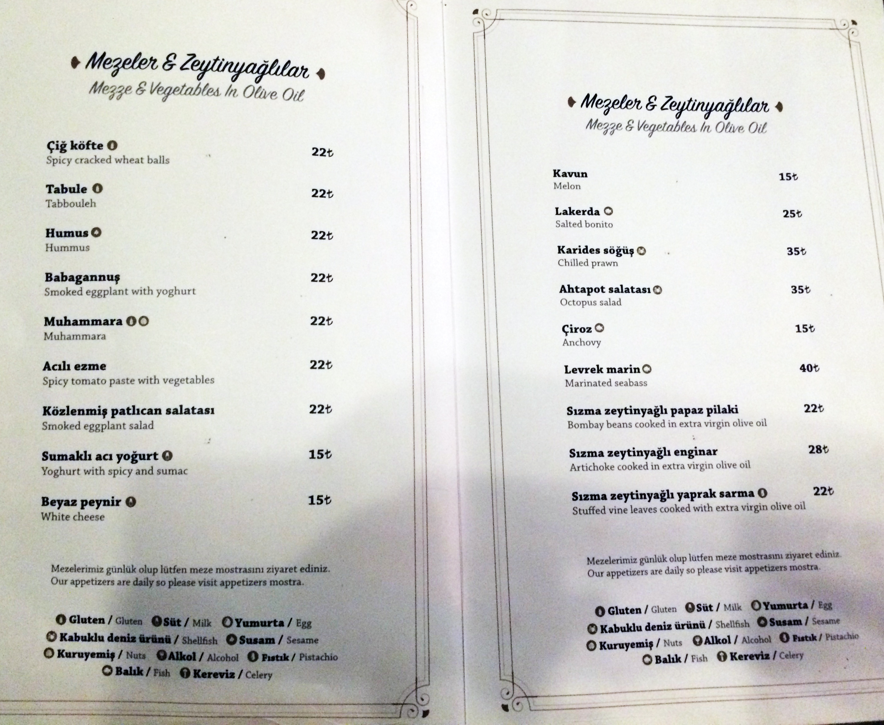 Цены для 5-звёздочного отеля вполне демократичные. Посмотрите, например, это меню закусок: в одной турецкой лире примерно 10 российских рублей. Официанты очень приветливы и виртуозно справляются со своими задачами.