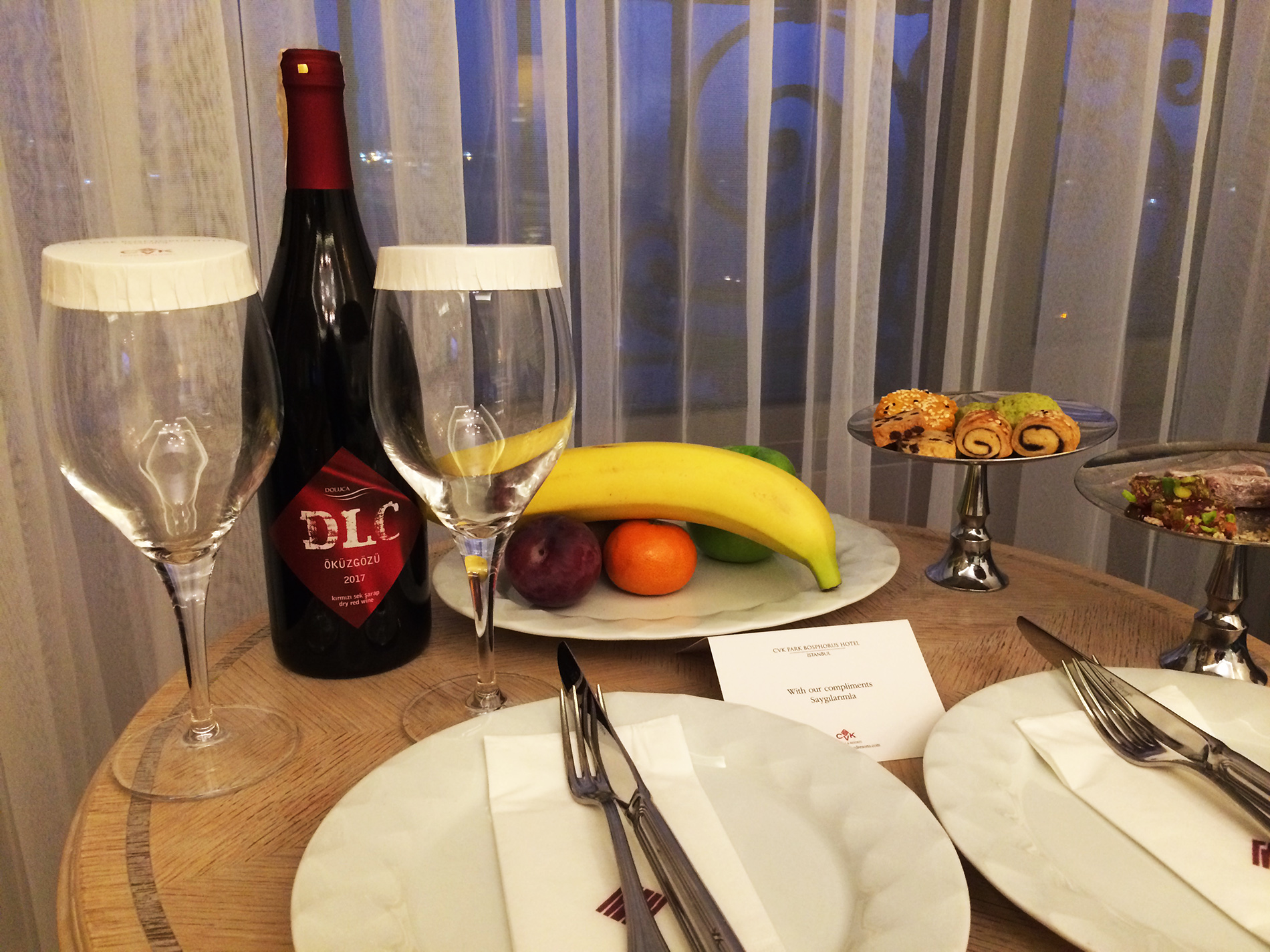 На кофейном столике уже ждут приветственные угощения и вино. Рекомендуем попробовать, достижения турецкого виноделия вас приятно удивят.