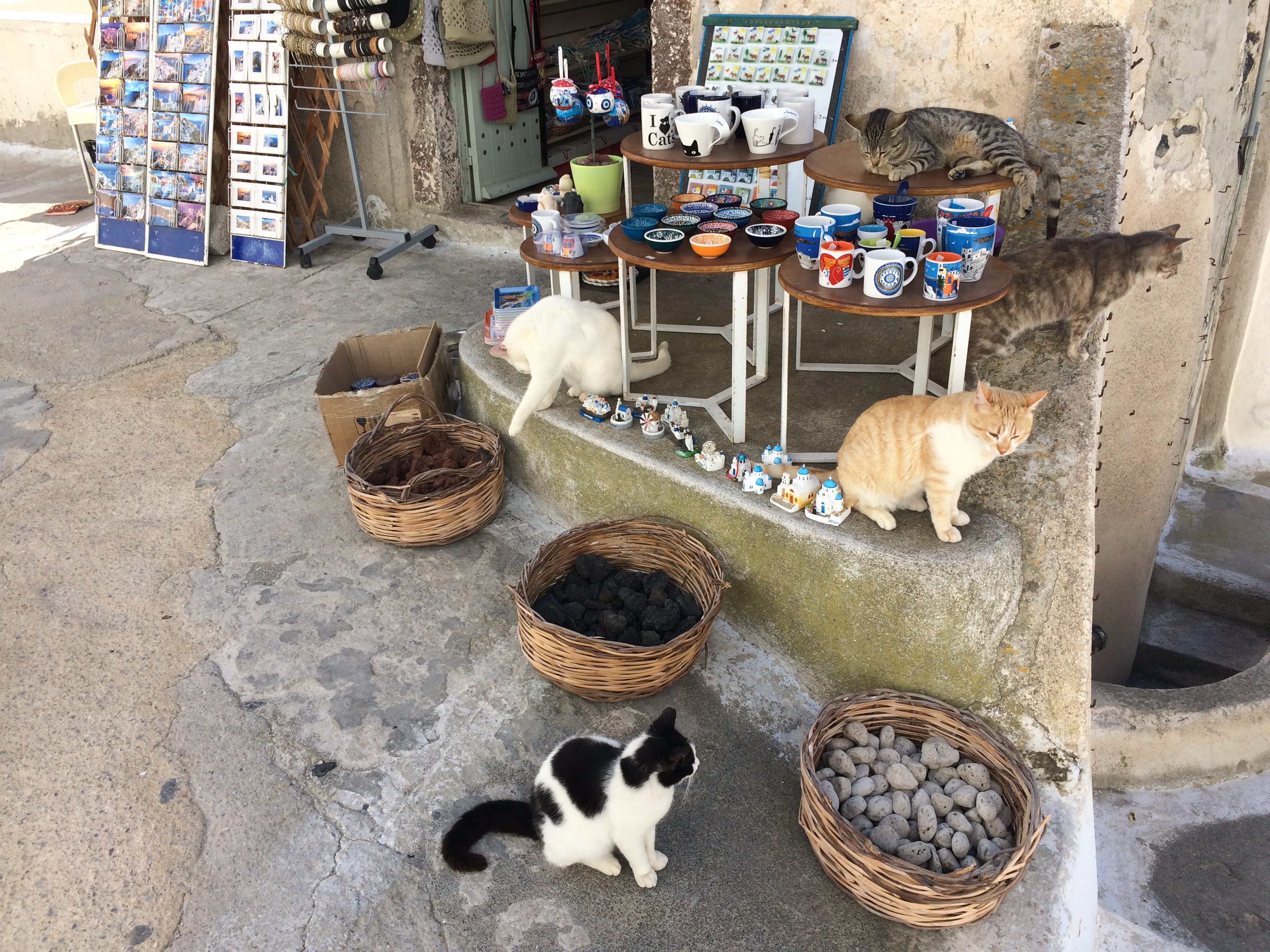 В деревушке Пиргос-Калистис на Санторини есть сувенирная лавочка, где можно встретить кошек всех мастей!