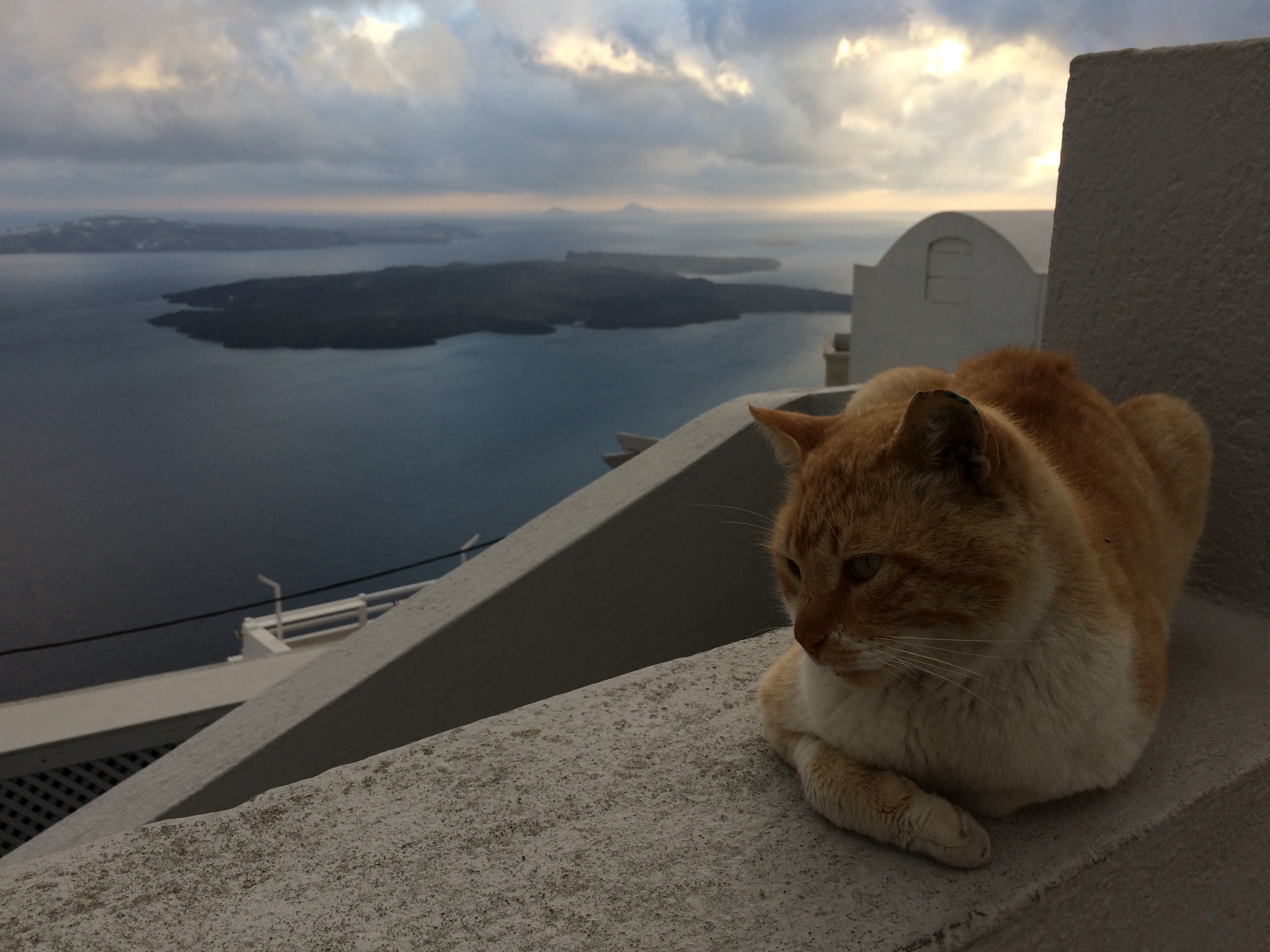 Знает ли этот пушистый житель острова Санторини, как прекрасно это место?