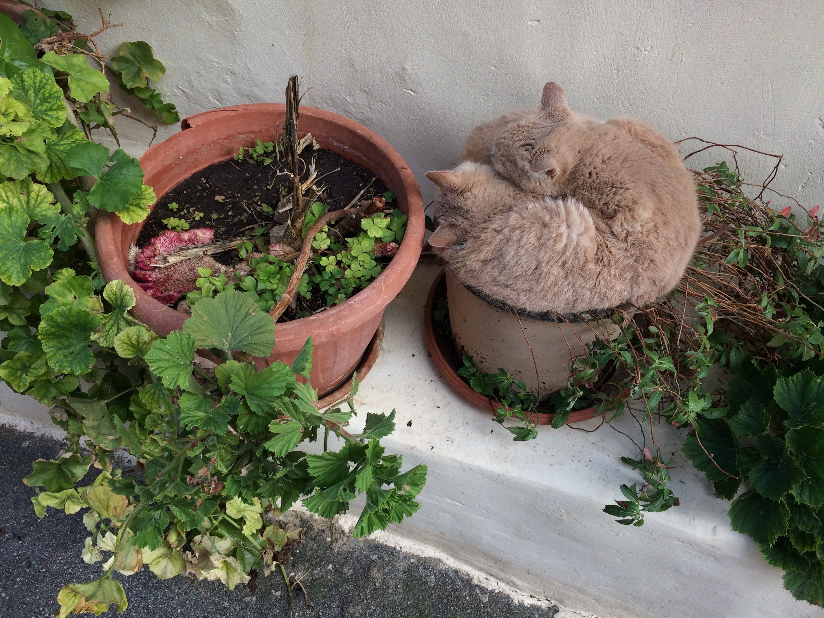В средневековом городе Мистра на Пелопоннесе у каждой кошки по горшку. Вот только зимой теплее вместе!