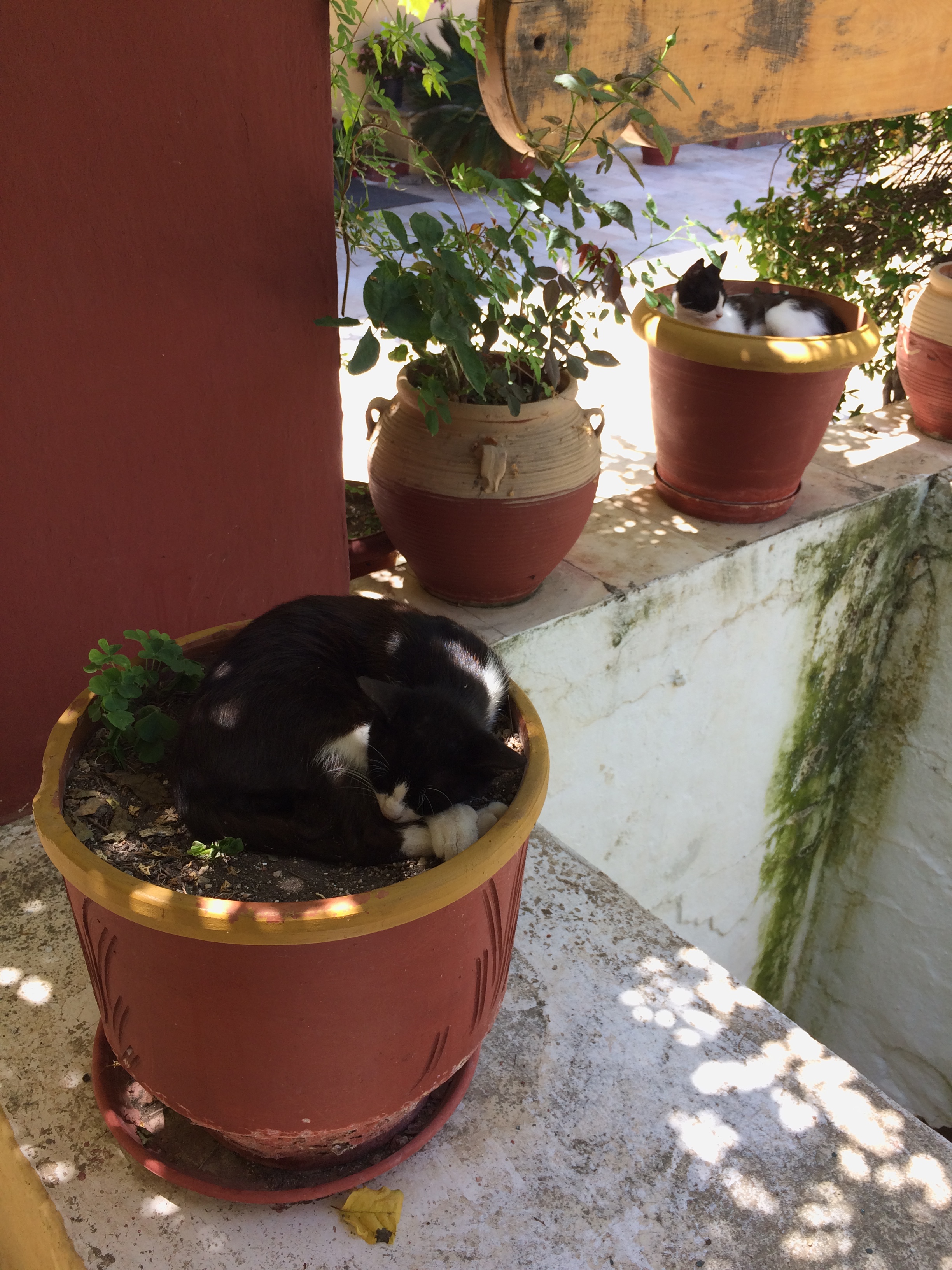 В монастыре Зоодоху Пигис на острове Корфу горшков тоже хватило бы на всех. Но «гнездиться» в них предпочитают почему-то чёрно-белые кошки. На этом фото 2 рыжих и 2 чёрных кошки. Нашли?