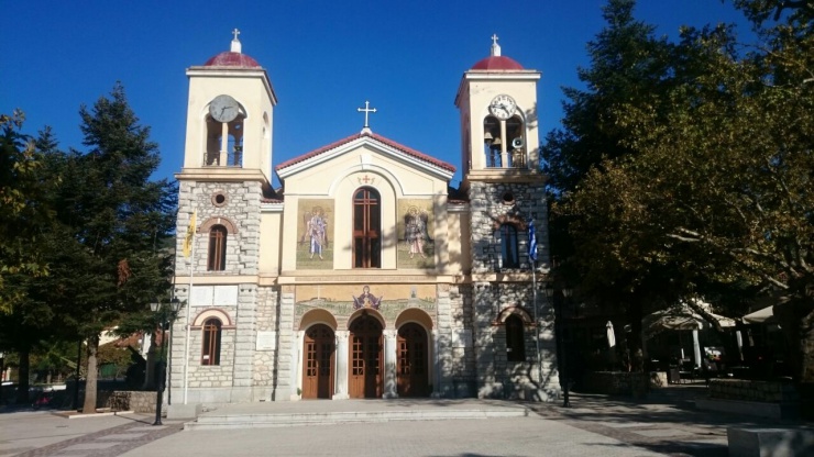 Храм Успения в Калаврите. На здании двое часов: те, что слева, служат напоминанием о страшных событиях 1943 года, когда немцы убили сотни местных жителей, а деревню подожгли. Из-за пламени стрелки на часах остановились навсегда и показывают 2 часа 34 минуты.