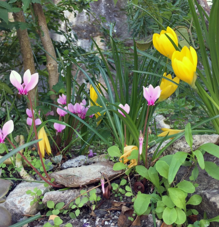 Красота прячется еще под ногами: цветут цикламены и желтые безвременники.