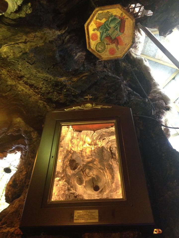 Вот как выглядит церковь - и всё это внутри древнего дерева! Ее история тесно связана с чудотворной иконой из расположенного неподалеку монастыря Мега Спилео (на следующем фото). Монахи, спасая чудотворную икону из сожженного турками монастыря, остановились в этом дереве на ночлег. А утром, сняв икону, они обнаружили на дереве ее «копию». Этот чудотворный образ можно увидеть и сегодня.