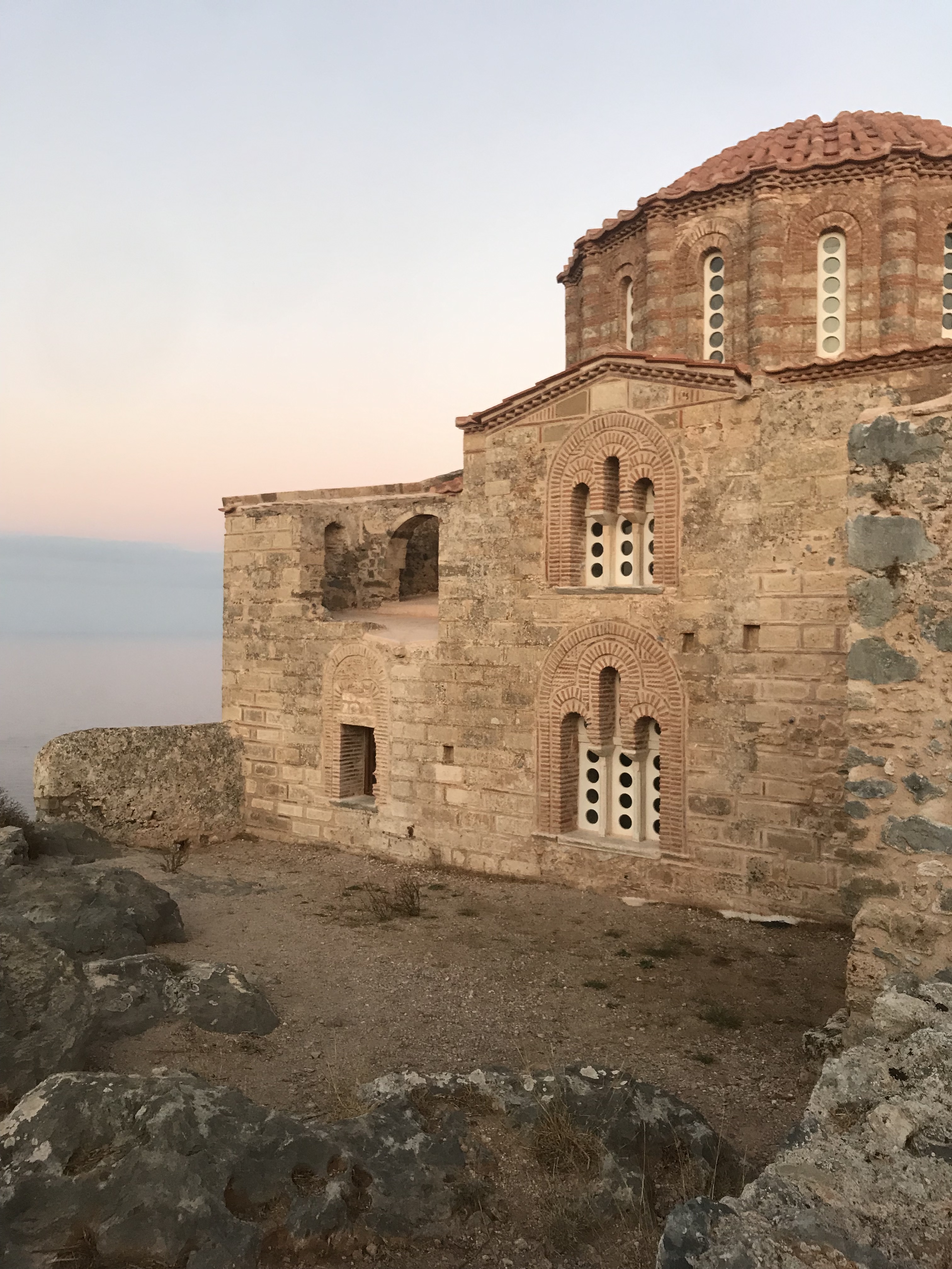 Византийская крепость на одноименном островке, соединённом с сушей дамбой. Она же Монемвасья, она же Мальвазия, виноград и вино. Узкие улочки, площадь с церковью Распятия Христа с иконой, которая была украдена, распилена на части, возвращена и восстановлена.