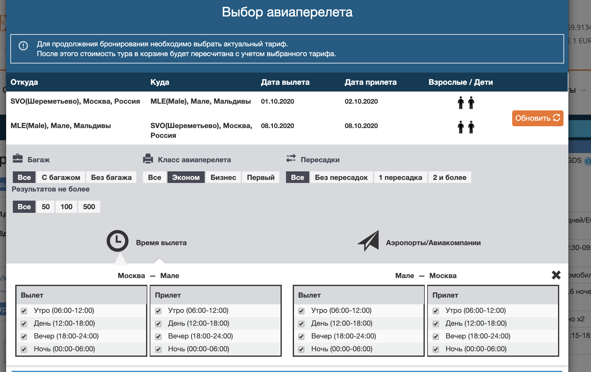 Если выбран тур с перелётом регулярным рейсом (GDS), то необходимо будет выбрать актуальный тариф авиакомпании в окне актуализации. Стоимость при этом может меняться как в меньшую, так и большую сторону.