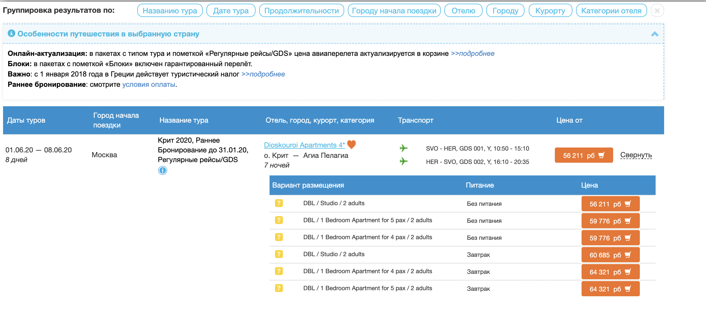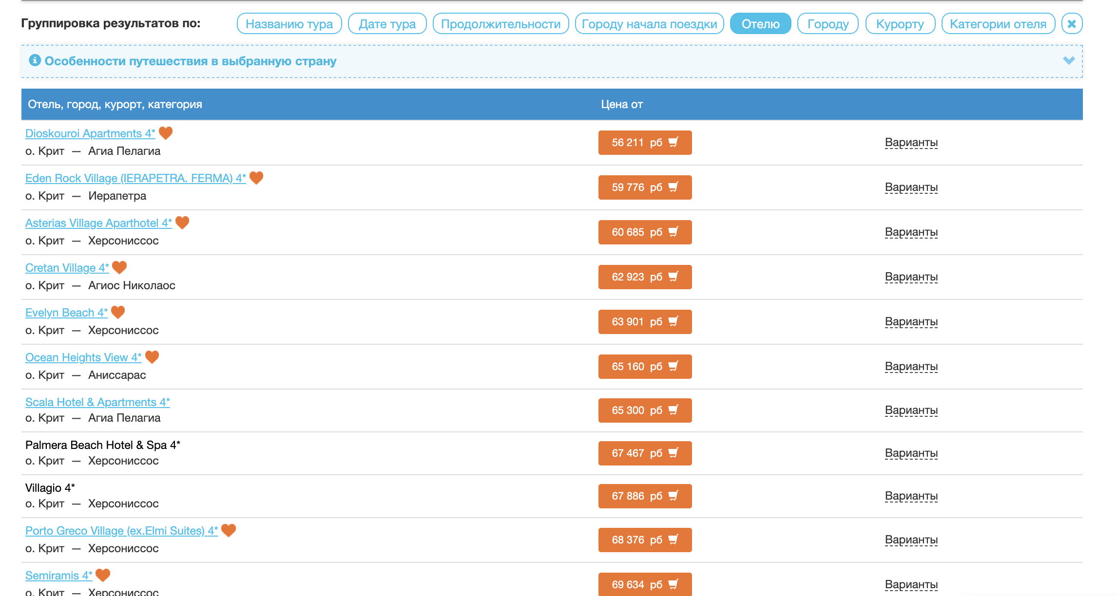 Например, вы хотите сравнить цены на отели 4* Крита в первую неделю июня. Для этого в форме поиска вам нужно выбрать Греция – Крит – отметить интересующие даты, в параметрах проживания проставить фильтр категории отеля (4*) и получившиеся результаты сгруппировать по отелю. В итоге вы получите список отелей 4* на выбранную дату по возрастанию цены.
