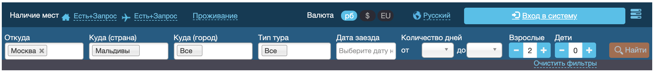 «Тип тура» – зависит от выбранной страны и отбирает результаты по указанному признаку: «Экскурсионный тур», «Майские праздники», блоки на Новый год, туры с перелётом на той или иной авиакомпании и т.д.