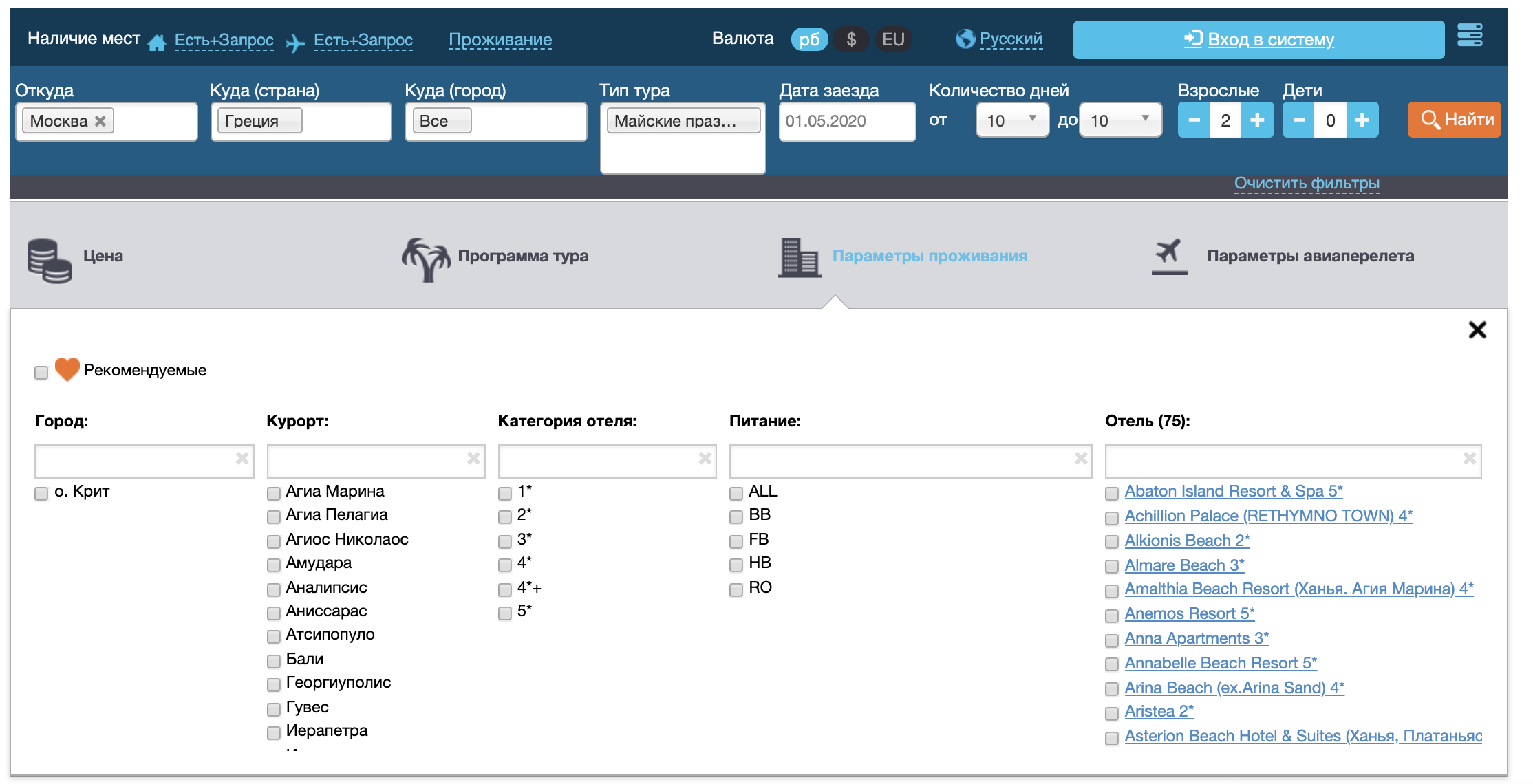 В «Параметрах проживания» можно выбрать город (остров) и курорт(ы), а также категорию отеля, тип питания или конкретный отель/отели из списка. Иконкой