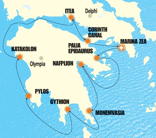 8-дневный круиз вокруг полуострова Пелопоннес: Древний Эпидавр, Нафплион, Гитион, Пилос, Катаколон, Древняя Олимпия, Итея, Дельфы и Коринф.