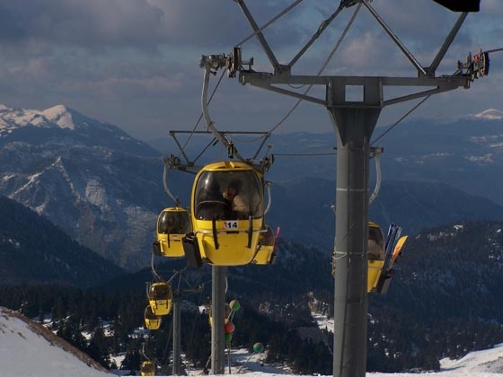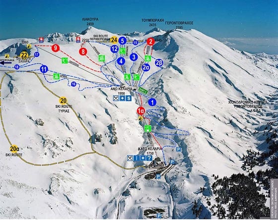 Трасса Эрмис: Подъемник Эрмис – трехместный кресельный подъемник, соединяющий станции Келлария и Фтеролаккас. После первых 700 м кресло подъемника проходит очень низко над землей, так что с него может спуститься каждый желающий. И вот с этой точки и до станции Келлария и существует одноименная трасса длиной 700 м, характеризуемая как красно-синяя. Перепад высоты-2100/1960 м
