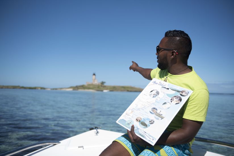 Путешествие начинается с посещения знаменитого морского парка Блю-Бэй для снорклинга среди кораллов и тропических рыб. Программа включает купание в прозрачной лагуне у острова Иль-о-Эгрет, экскурсию на остров с маяком и вторую остановку для снорклинга в О-Блё. Также предусмотрен визит к водопадам Большой Юго-Восточной реки и отдых с обедом на уединенном пляже рядом с островами Иль-о-Манжени и Иль-о-Серф.