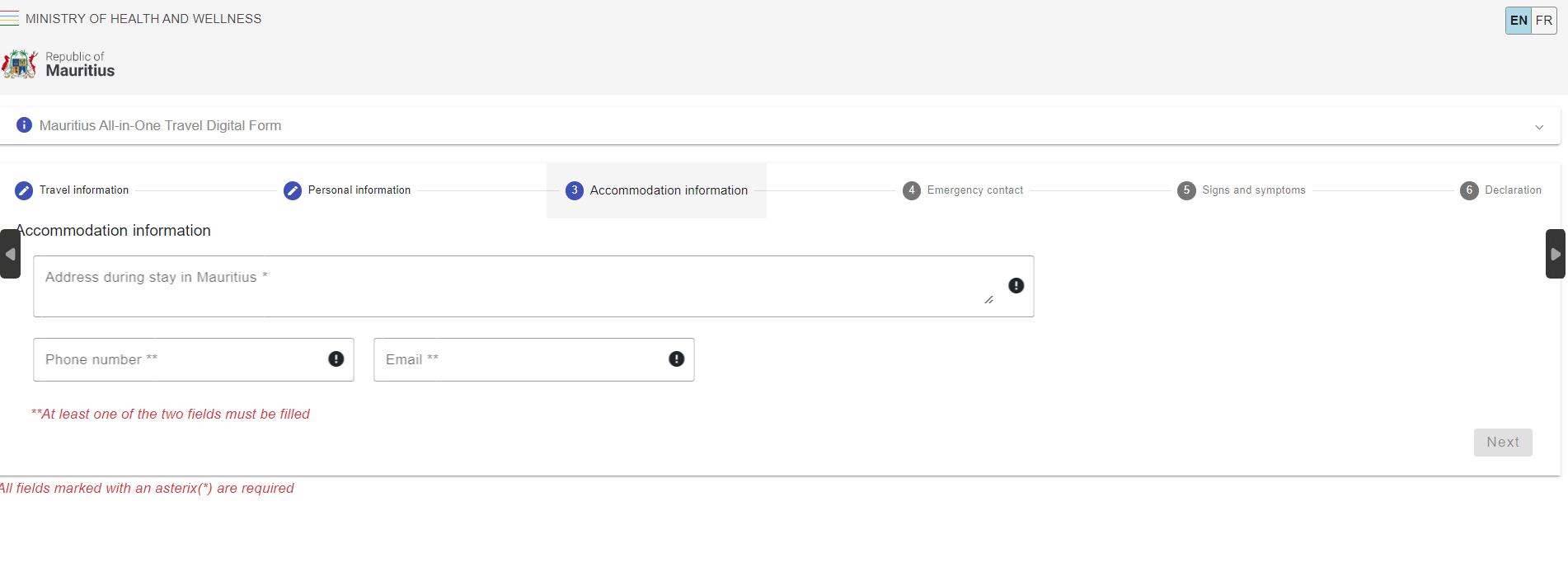 Заполняем информацию о размещении на острове. Указываем адрес проживания на Маврикии (Address during stay in Mauritius): например, название отеля, виллы. На этом этапе по выбору заполняется одно из полей: контактный номер телефона и адрес электронной почты (опционально).