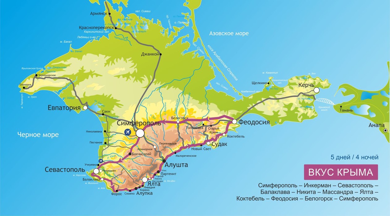 Симферополь – Инкерман – Севастополь – Балаклава – Никита – Массандра – Ялта – Коктебель – Феодосия – Белогорск – Симферополь.