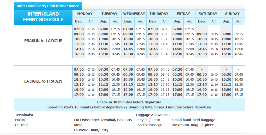 См. расписание паромов Маэ - Праслин, Маэ - Ла Диг и обратно, действительно до 31.12.2024.