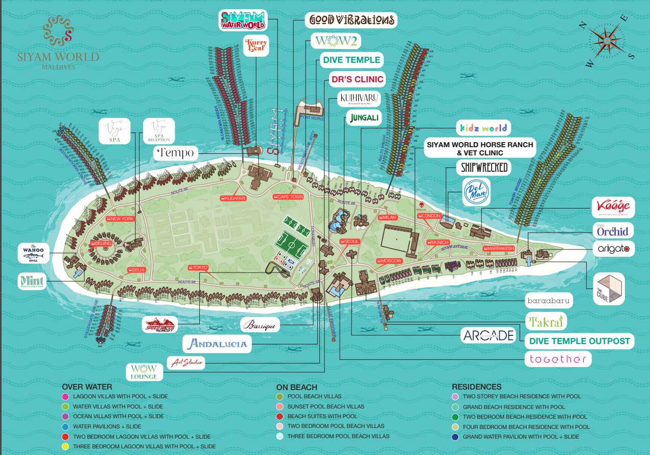 Siyam World Maldives – остров-курорт в атолле Нууну, предлагающий отдых по концепции «Всё включено Премиум». Номерной фонд отеля включает виллы на пляже и на воде, самая большая – резиденция с 6 спальнями. Для гостей работают 8 ресторанов и 7 баров, в том числе один круглосуточный, плавучий аквапарк, спа-салон, для маленьких гостей – детский клуб. Домашний риф начинается всего в нескольких метрах от берега.