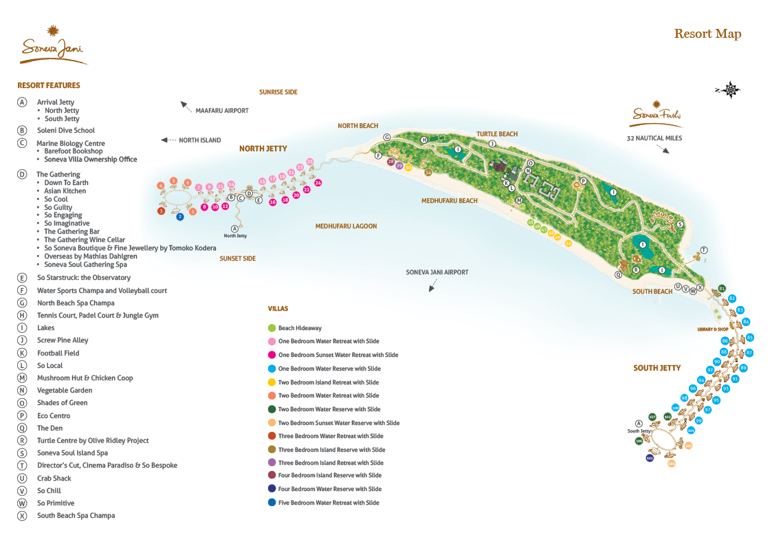 Soneva Jani − это роскошный курорт на Мальдивах, расположенный на частном архипелаге в лагуне Медхуфару, на атолле Ноону. Курорт славится своими уникальными виллами на воде и островными виллами, каждая из которых предлагает великолепные виды на Индийский океан. Главная особенность многих вилл — это раздвижные крыши над спальнями, которые позволяют гостям наслаждаться видом на звездное небо прямо из своей кровати. На курорте Soneva Jani 59 вилл: 51 водная и 8 пляжных.
