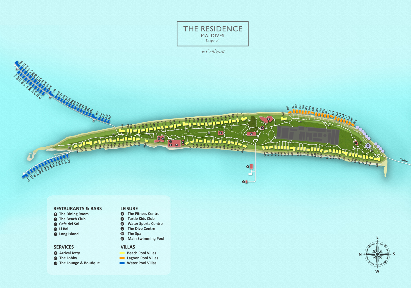 Отель Residence Maldives at Dhigurah находится на острове Дигура атолла Гаафу Алифу, который соединён мостом с островом, на котором расположен отель The Residence Maldives 5* Falhumaafushi.