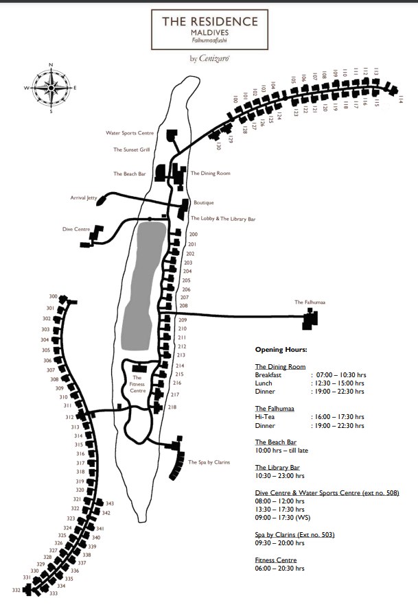 Отель Residence Maldives расположен на уединенном живописном острове Фалхумаафуши и связан мостом с отелем Residence Maldives at Dhigurah. К услугам гостей роскошно обставленные виллы с собственной террасой, открытый бассейн, тренажёрный зал и спа-центр Clarins. В отеле организуют занятия дайвингом и сноркелингом. На некоторых виллах есть собственный бассейн. Курорт располагает собственным дайвинг-центром PADI 5* и окружен редкими и нетронутыми коралловыми рифами. Глубина домашнего рифа отеля The Falhumaa Reef – от 1 до 28 метров.