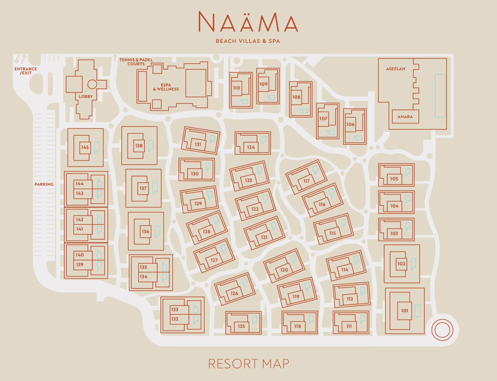 Naäma Beach Villas & Spa — эксклюзивный курорт, расположенный в прибрежной зоне Аль-Ака между горами Хаджар и Индийским океаном. Курорт предлагает 44 частные виллы с бассейнами в арабском стиле. За каждой виллой закреплён персональный батлер.