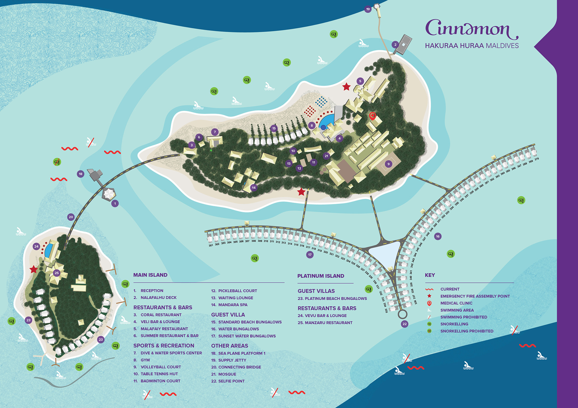 Отель Cinnamon Hakuraa Huraa Maldives – 5* звёздочный курорт только для взрослых, расположенный на двух уединённых островах атолла Мииму. На главном острове доступно 70 бунгало на воде и 10 пляжных бунгало, а также ресторан, лаужндж-бар и бассейн. 20 бунгало Platinum Beach расположены на отдельном острове с эксклюзивным рестораном, лаундж-баром и бассейном, предназначенным только для гостей Platinum Beach Bungalow. Остров Platinum соединен с главным курортом пешеходной дорожкой.