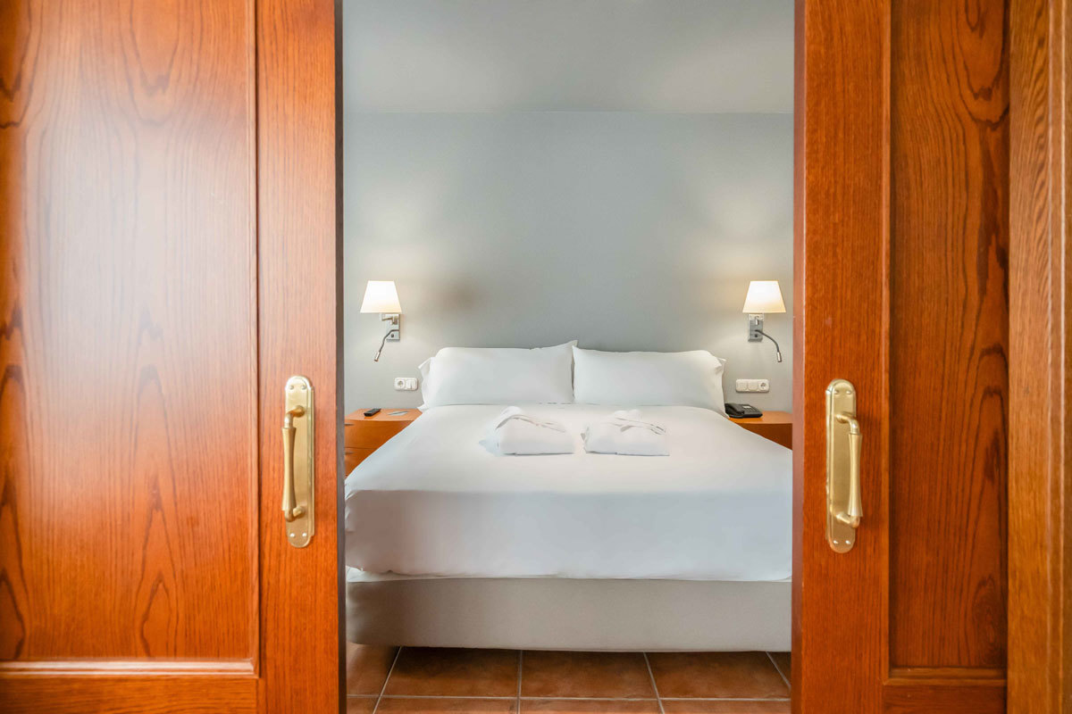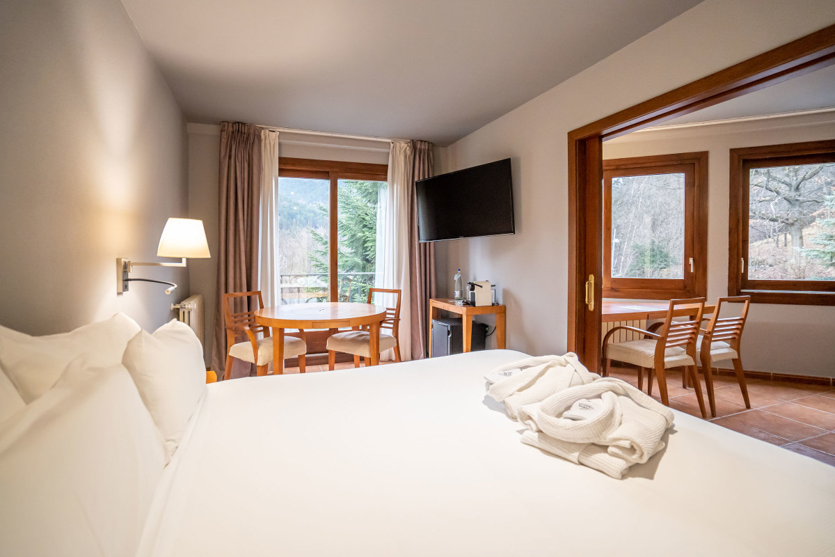 В здании Xalet, двуспальная кровать (1,8 х 1,9 м) или 2 односпальные кровати (0,9 х 1,9 м), ванная комната с душем, у некоторых номеров вид на сад с бассейном при отеле или на долину Аньос и её романскую церковь Сан-Кристобаль, чайник;