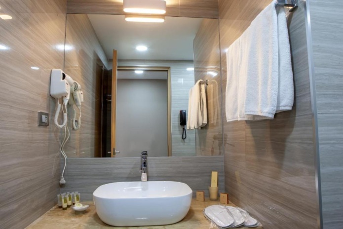 В номерах: ортопедические матрасы, кондиционер, холодильник, фен, телефон, телевизор со спутниковыми каналами, Wi-Fi, мини-бар, сейф, утюг, холодильник, рабочий стол, гладильная доска, банные принадлежности, тапочки, будильник, чайник, шкаф, защитные крышки на розетках.