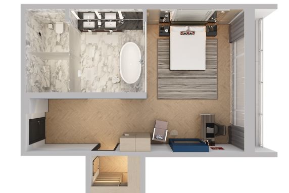 Спальня с двуспальной кроватью king-size, гостиная комната с диваном и обеденным столом, окна от пола до потолка, ванная комната с ванной, см. план номера. Доступ в клубную гостиную с 06:30 до 23:00: бесплатные угощения (дневные закуски, послеобеденный чай, легкие закуски перед ужином, десерты, поздние вечерние закуски, закуски Grab & Go в течение дня), высокоскоростной Wi-Fi, бесплатные коктейли, бесплатные безалкогольные напитки, бизнес-услуги без дополнительной платы, бесплатная глажка (2 вещи за ночь), расширенное меню a la carte (за дополнительную плату), вечерний бар-сервис;