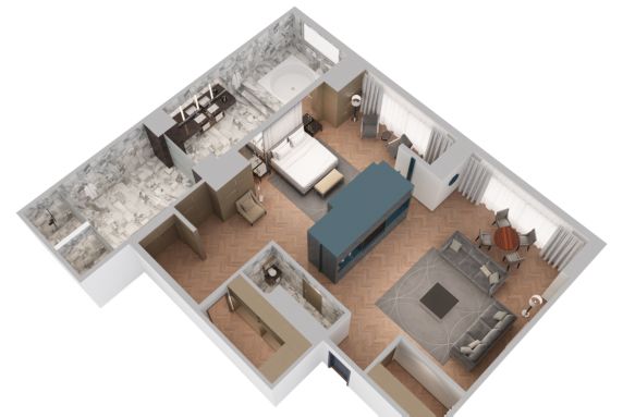 2 спальни с двуспальными кроватями king-size, гостиная комната с диваном и обеденным столом, 2 ванные комнаты, см. план номера. Доступ в клубную гостиную с 06:30 до 23:00: бесплатные угощения (дневные закуски, послеобеденный чай, легкие закуски перед ужином, десерты, поздние вечерние закуски, закуски Grab & Go в течение дня), высокоскоростной Wi-Fi, бесплатные коктейли, бесплатные безалкогольные напитки, бизнес-услуги без дополнительной платы, бесплатная глажка (2 вещи за ночь), расширенное меню a la carte (за дополнительную плату), вечерний бар-сервис;