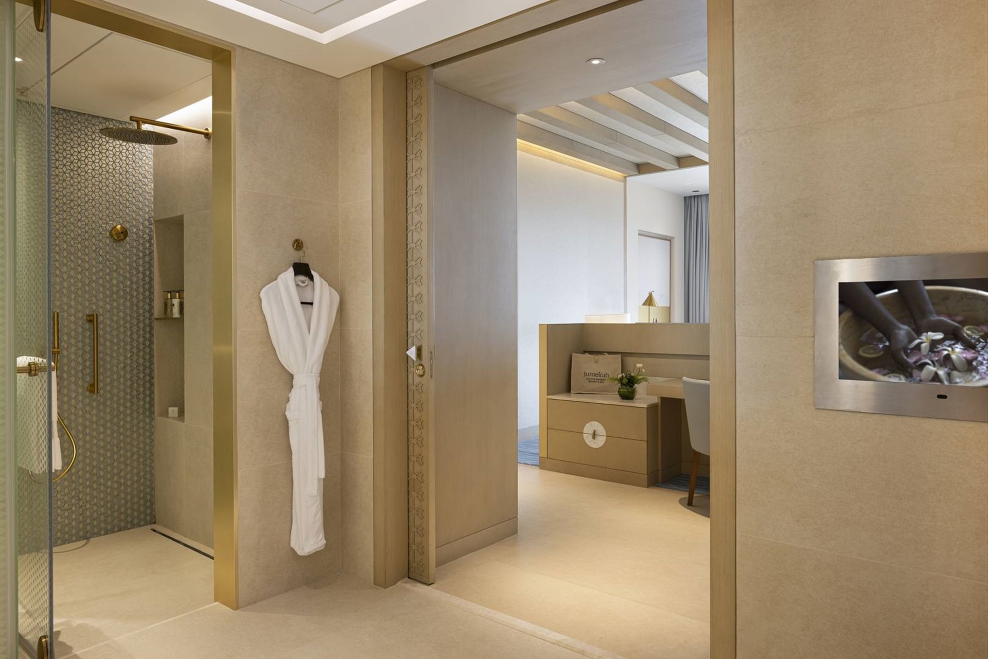 2 спальные зоны разделены раздвижной дверью (двуспальная кровать king-size и диван-софа), гостиная зона с креслами, гардеробная, ванная комната с ванной и душем, балкон, халаты, тапочки, меню подушек;