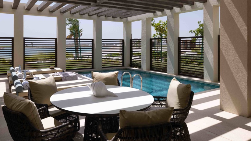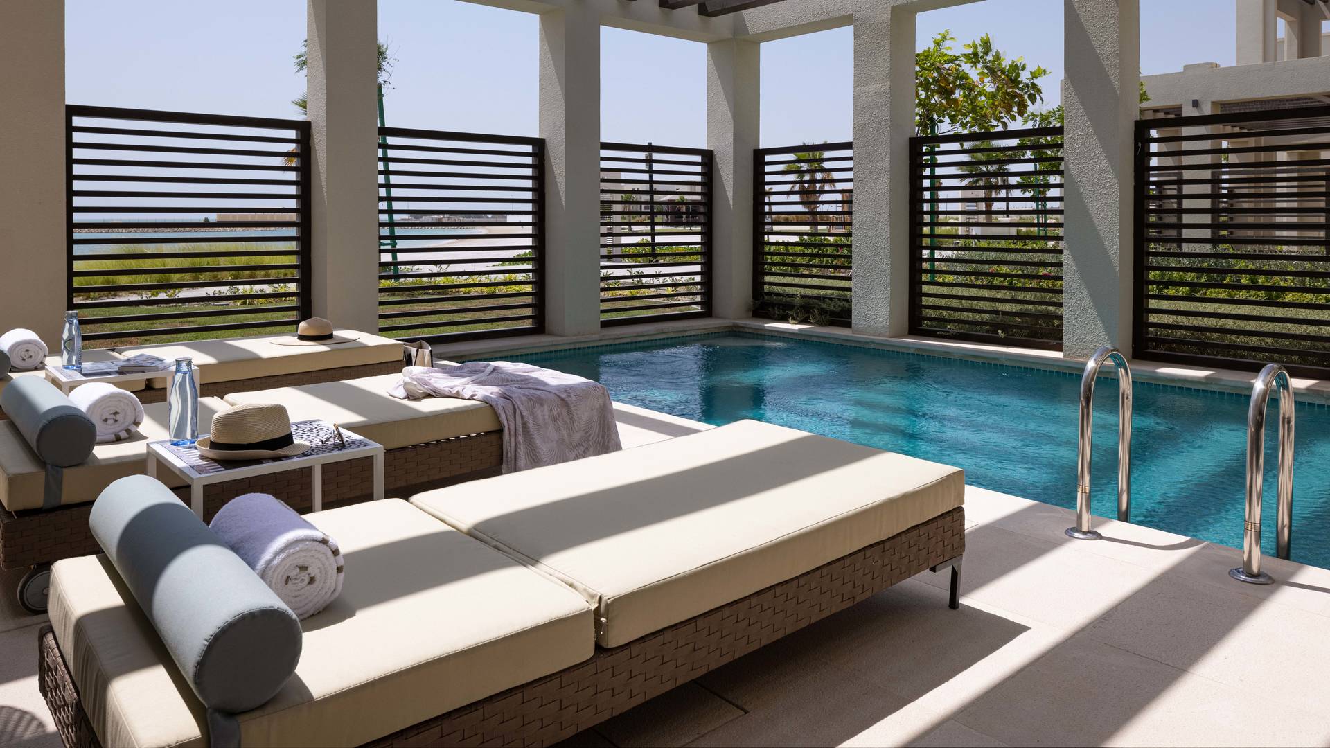Номер расположен рядом с пляжем, спальня с двуспальной кроватью king-size, отдельная гостиная комната с 2 диванами и обеденным столом на 6 человек, ванная комната, просторная меблированная терраса с персональным бассейном, лежаками и зоной отдыха, вид на океан, ранняя регистрация заезда и поздняя регистрация отъезда при наличии возможности, а также бесплатный завтрак «шведский стол».