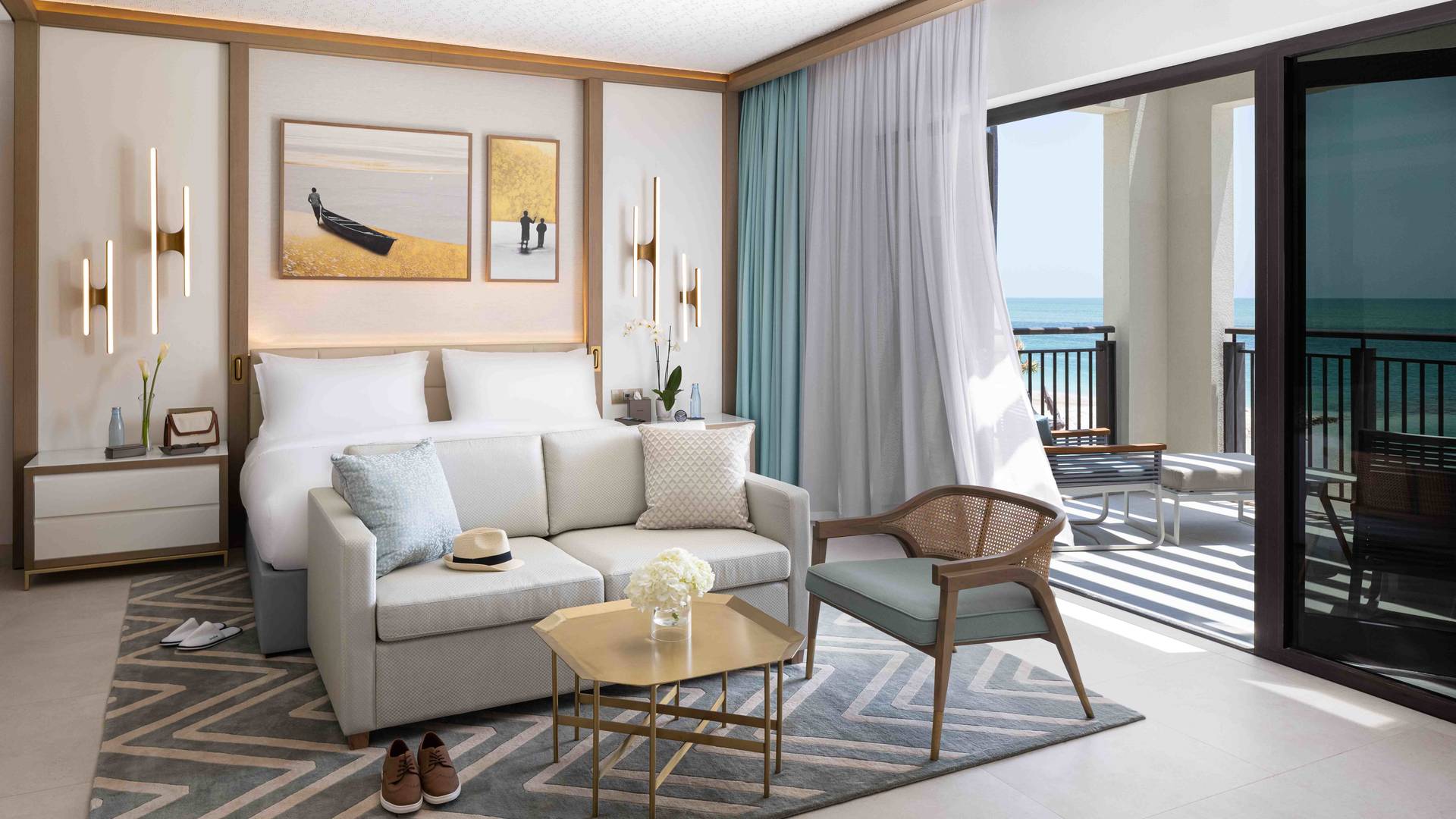Спальня с двуспальной кроватью king-size и гостиной зоной, отдельная гостиная комната с диваном, ванная комната с ванной и душем, просторный балкон, вид на океан боковой или прямой, ранняя регистрация заезда и поздняя регистрация отъезда при наличии возможности, а также бесплатный завтрак «шведский стол»;