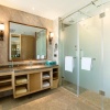 В номерах ванная комната открытой планировки отделена от жилого пространства небольшой ширмой, душевая кабина и туалет за матовой стеклянной перегородкой.