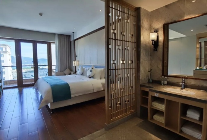 Номер расположен на 6-10 этажах, двуспальная кровать king-size или 2 односпальные кровати, зона ванной комнаты отделена ширмой, душевая кабина со стеклянной матовой перегородкой, гостевая зона, меблированный балкон, вид на город , на горы, на залив;