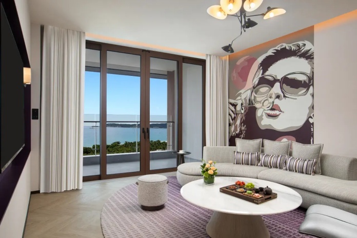 10-й этаж, семейный люкс с дизайном для детей: главная спальня с кроватью king size и гардеробной, детская спальня (без окна) с двухъярусной кроватью в виде ракеты, просторная гостиная с панорамными окнами, обеденной зоной и полностью укомплектованной кухонной зоной (плита, СВЧ-печь, раковина, посудомоечная машина, холодильник, кофемашина), ванная комната с душевой кабиной и сауной, два туалета, балкон с ванной, панорамный вид на океан с самой высокой точки обзора в отеле;