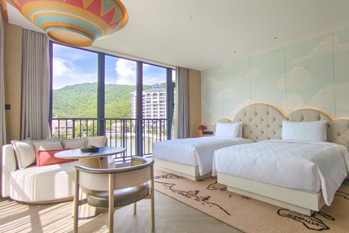 6-10 этаж, семейный люкс с дизайном для детей: спальня с 2-мя односпальными кроватями, гостиная зона, детская двухъярусная кровать в виде ракеты, ванная комната с душевой кабиной, балкон с ванной, вид на океан с высокой точки обзора;