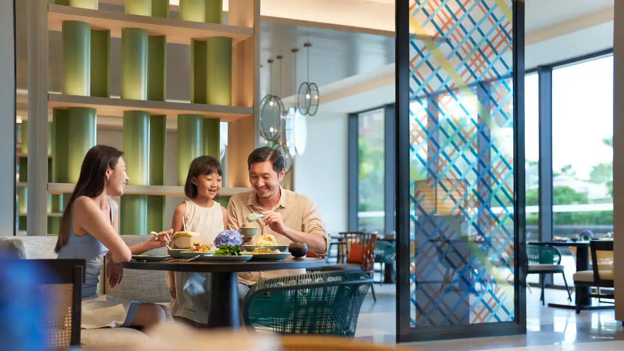 Семейный люкс с двумя спальнями: главная спальня с двуспальной кроватью king-size, спальня для детей с двухъярусной кроватью; отдельная гостиная с обеденной зоной, мини-кухня, 2 ванные комнаты, ванна и душ, меблированный балкон, вид на тропический сад/ на залив;