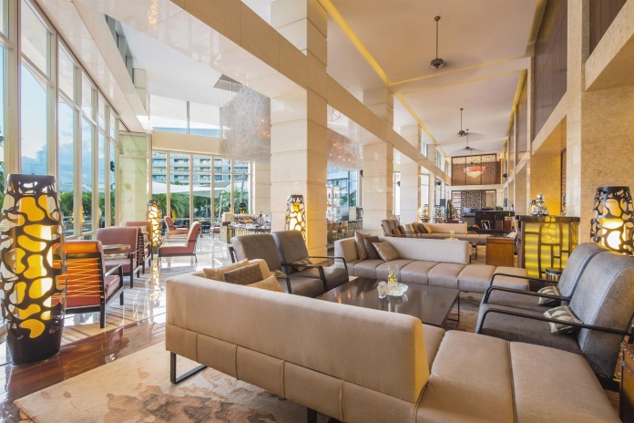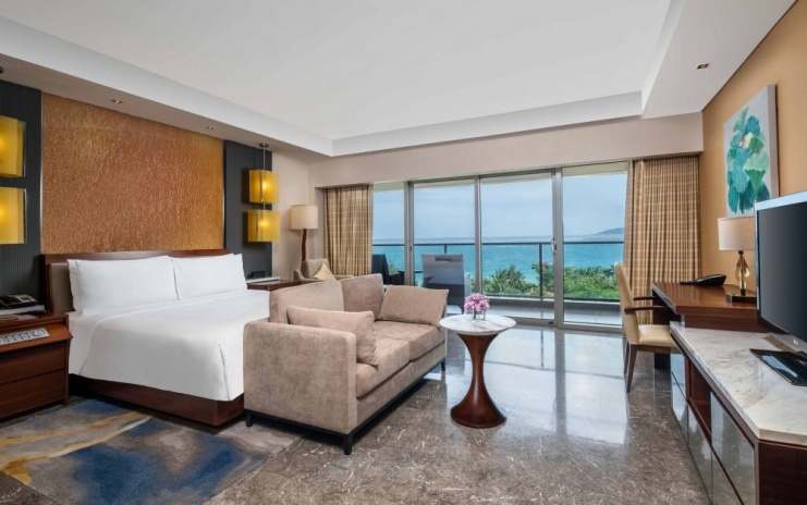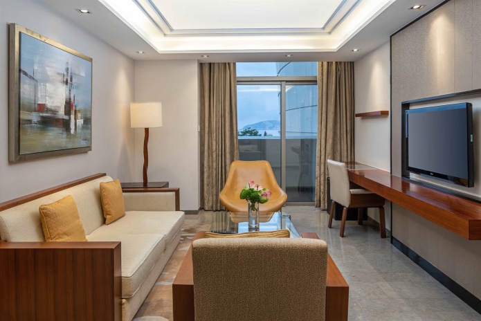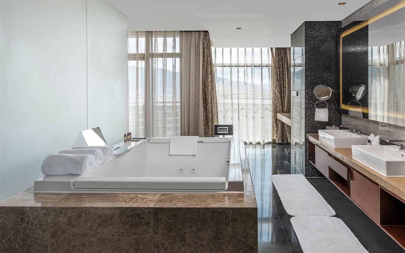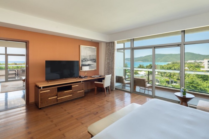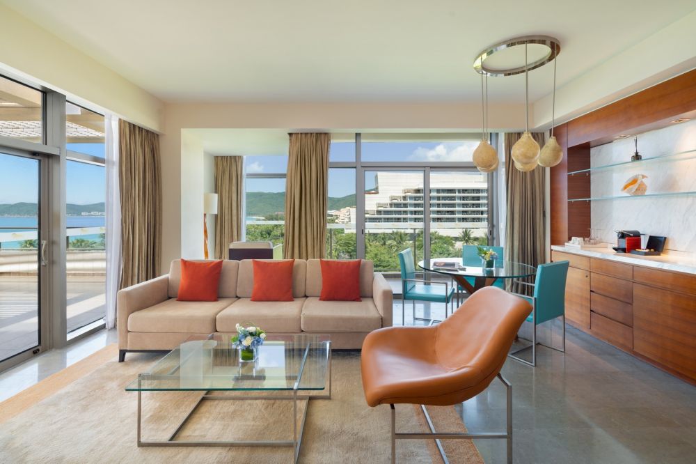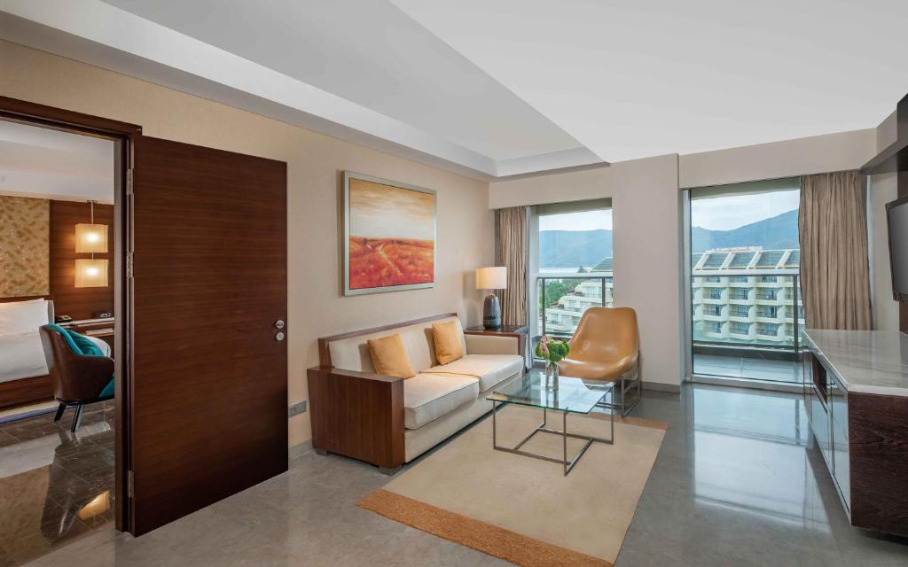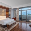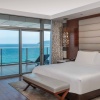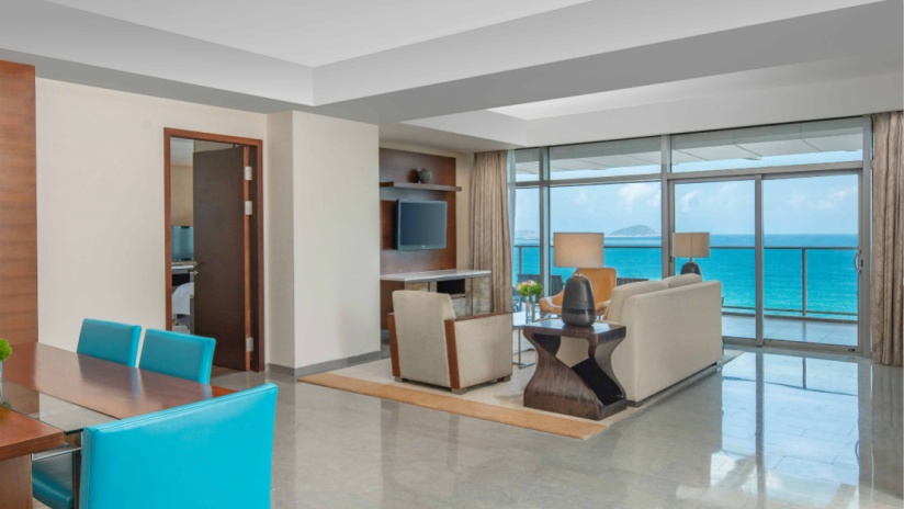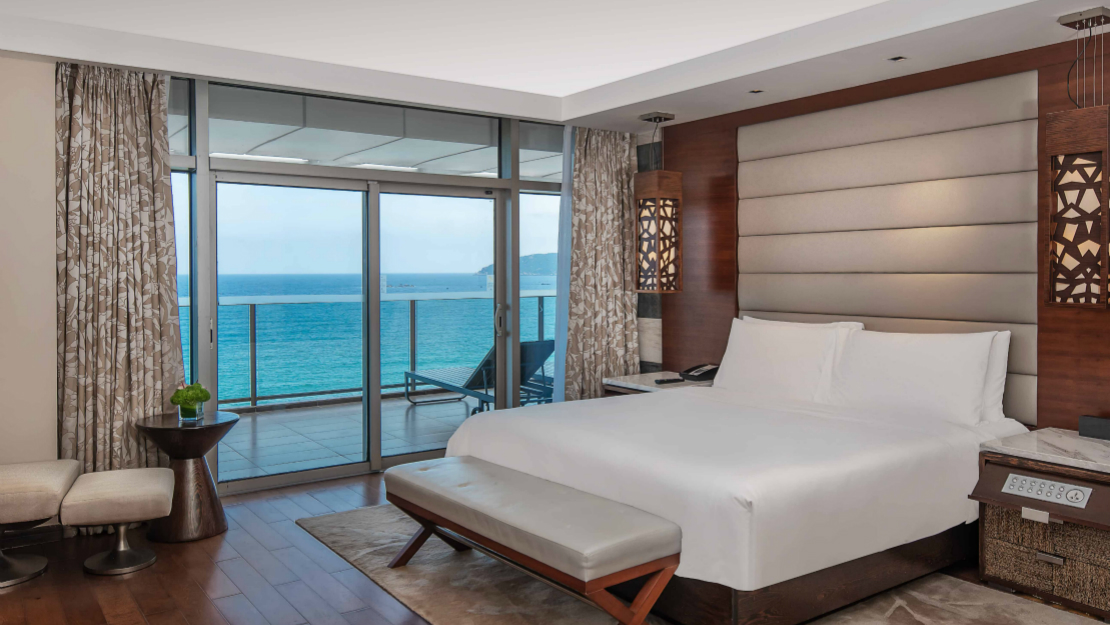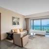 Просторный двухкомнатный сьют на 5–9 этажах: спальня с двуспальной кроватью king-size, ванная комната с ванной и душем, гостиная с зоной отдыха и обеденной зоной, меблированный балкон, панорамный вид на океан;