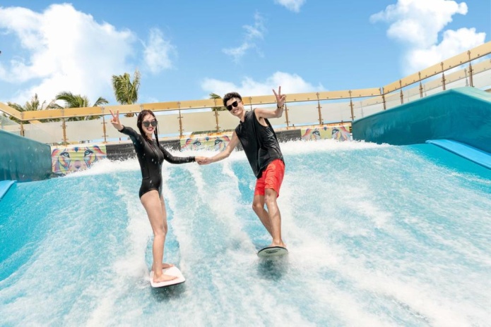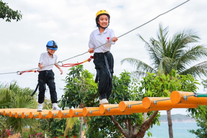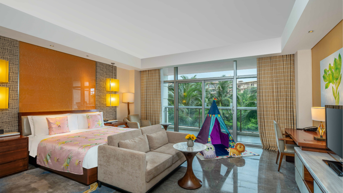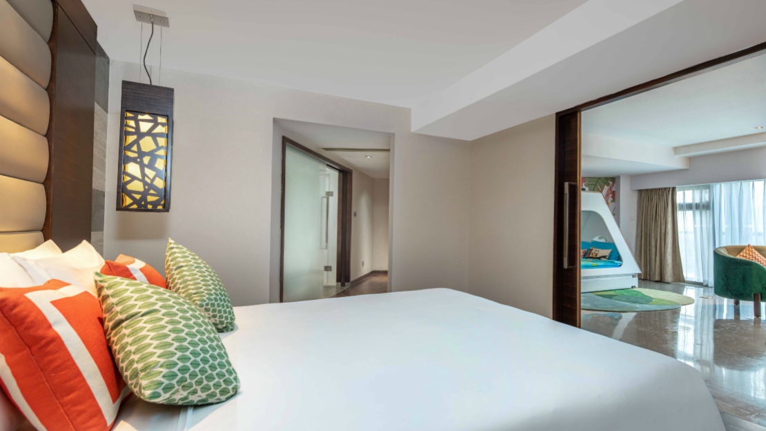 Семейный сьют с 2-мя спальнями на 3–5 этажах: двуспальная кровать king-size и двуспальная кровать queen-size, 2 ванные комнаты, принадлежности для детей, игровые зоны «Домик на дереве» и «Спортивные соревнования», горки, игрушки, отдельный детский туалет, меблированный балкон, частичный вид на океан;
