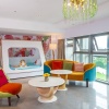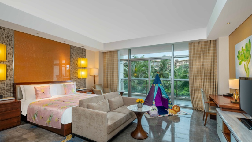 Двухкомнатный семейный сьют на 6–9 этажах: панорамные окна, спальня с двуспальной кроватью, ванная комната с ванной и душем, гостиная (есть дверь между комнатами), принадлежности и игрушки для детей, меблированный балкон, вид на океан;