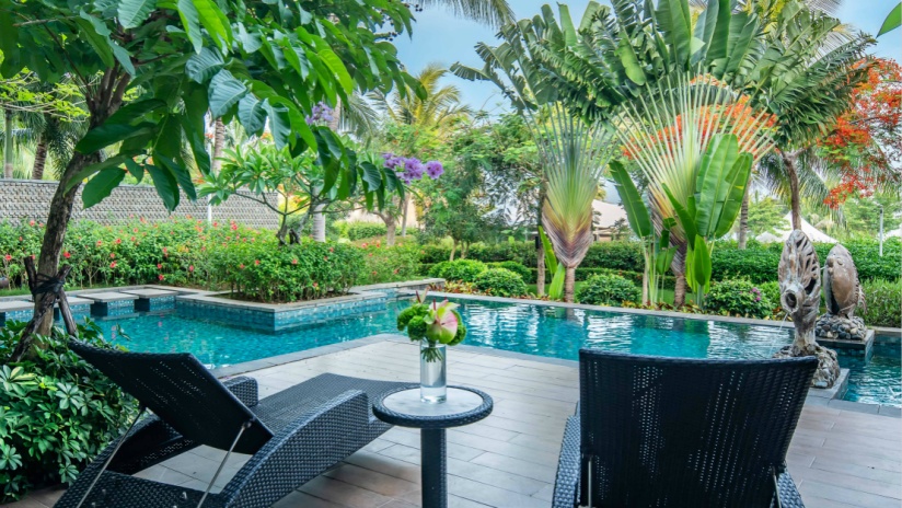 Отдельная вилла c 3-мя спальнями: стеклянные двери от пола до потолка, в одной спальне – двуспальная кровать, в двух других – по 2 односпальные кровати, в каждой спальне – собственная ванная комната с ванной и душем, гостиная с зоной отдыха, обеденная зона, кухня, кабинет, комната для спа-процедур, меблированная терраса с обеденным столом, сад, собственный бассейн с постоянной температурой воды (глубина 1, 25 м, длина 12 м), душ на свежем воздухе, вид на сад.