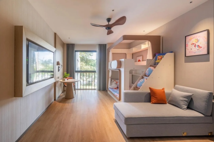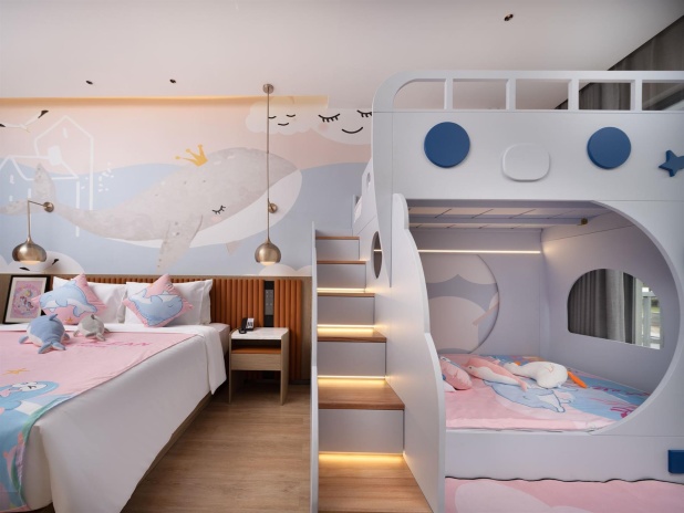 Сьют на 2 – 5 этаже с 2-мя спальнями: двуспальная и двухъярусная кровать (оформление в детской тематике), ванная комната с душем, без балкона, с окном от пола до потолка, вид на океан;