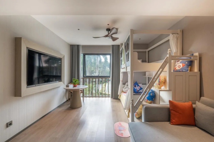 Сьют на 2 – 5, 7 этаже с 2-мя спальнями: двуспальная и двухъярусная кровать (оформление в детской тематике), ванная комната с душем, без балкона, с окном от пола до потолка, вид на сад;