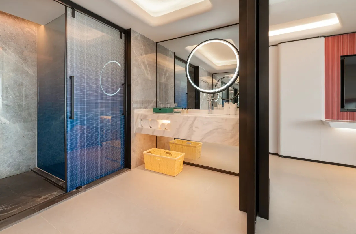 В номерах ванная комната отделена от жилой зоны сдвижными матовыми перегородками, в люксах - раздвижными дверьми.