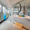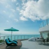 5 этаж, дизайнерский люкс открытой планировки с двуспальной кроватью (ширина 1,8 м, гостевой и обеденной зонами, отдельная ванная комната с душевой кабиной и ванной, балкон-терраса с ванной на свежем воздухе, шезлонгами и зонтом, вид на море;