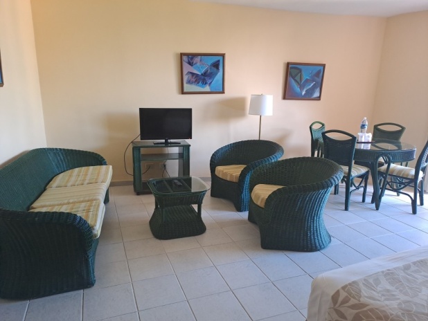 Двуспальная кровать, гостиная зона с диваном-кушеткой, креслами и обеденным столом, ванная комната с душем, балкон, вид на бассейн;