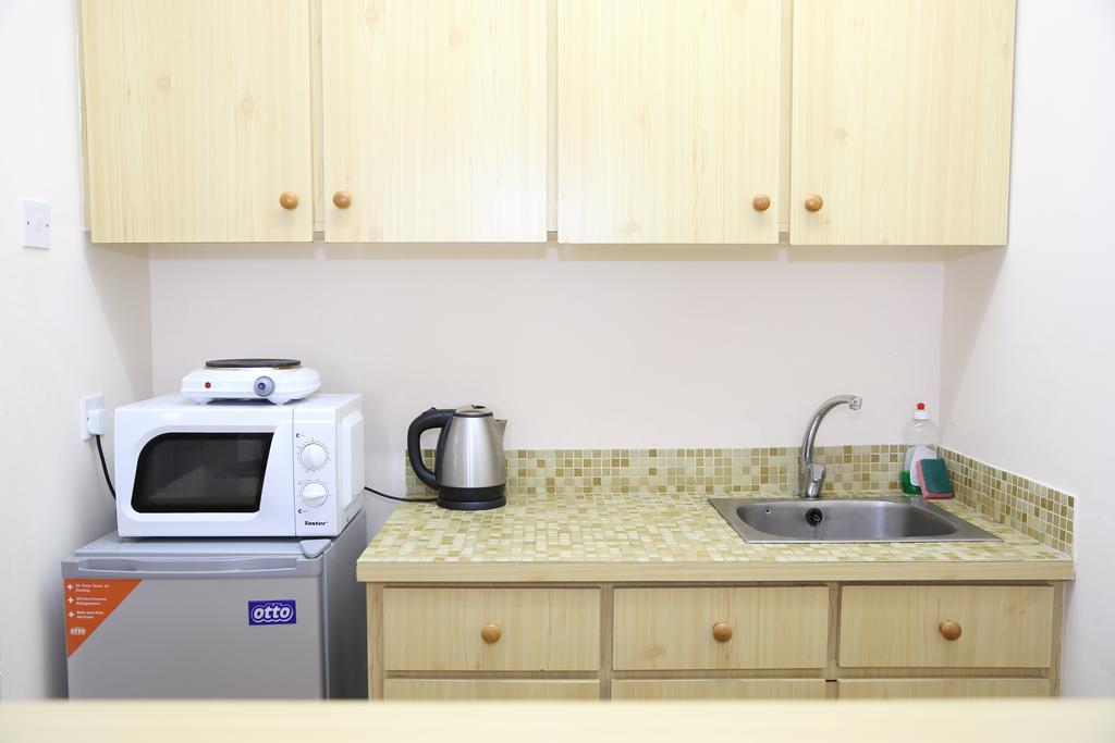 Studio - 25 кв.м., мини-кухня (микроволновая печь, плитка, чайник, кастрюли, тарелки, ложки, ножи, раковина).