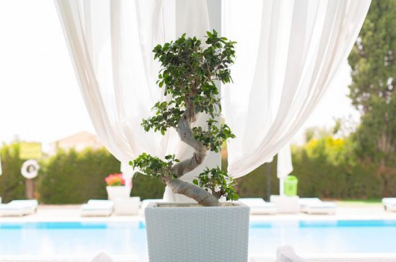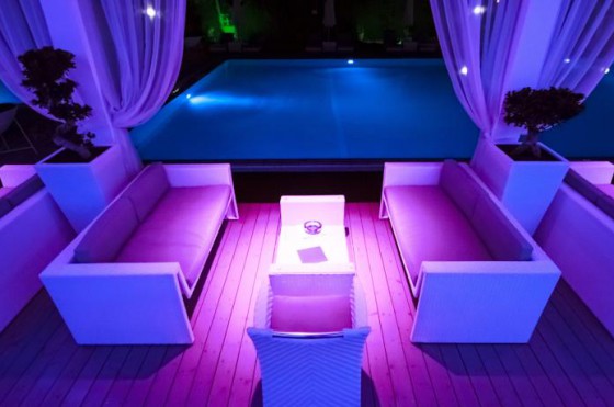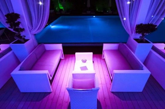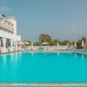Открытый бассейн с солнечной террасой, лежаками и зонтиками.